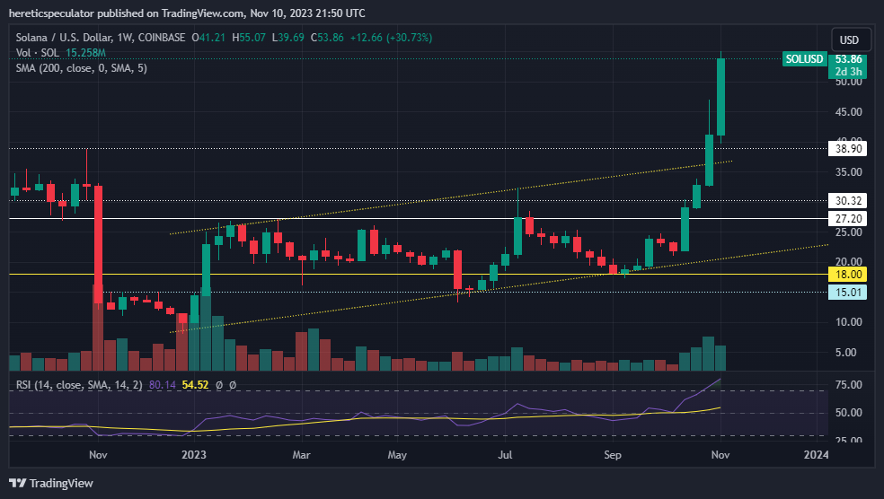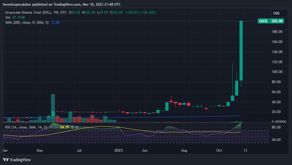 GSOL, which ended the week at $202 per share, recorded an absolutely blistering 146% weekly gain. You may be wondering, “so what?” After all, Solana $SOL-USD has also been absolutely pumping over the last several weeks: